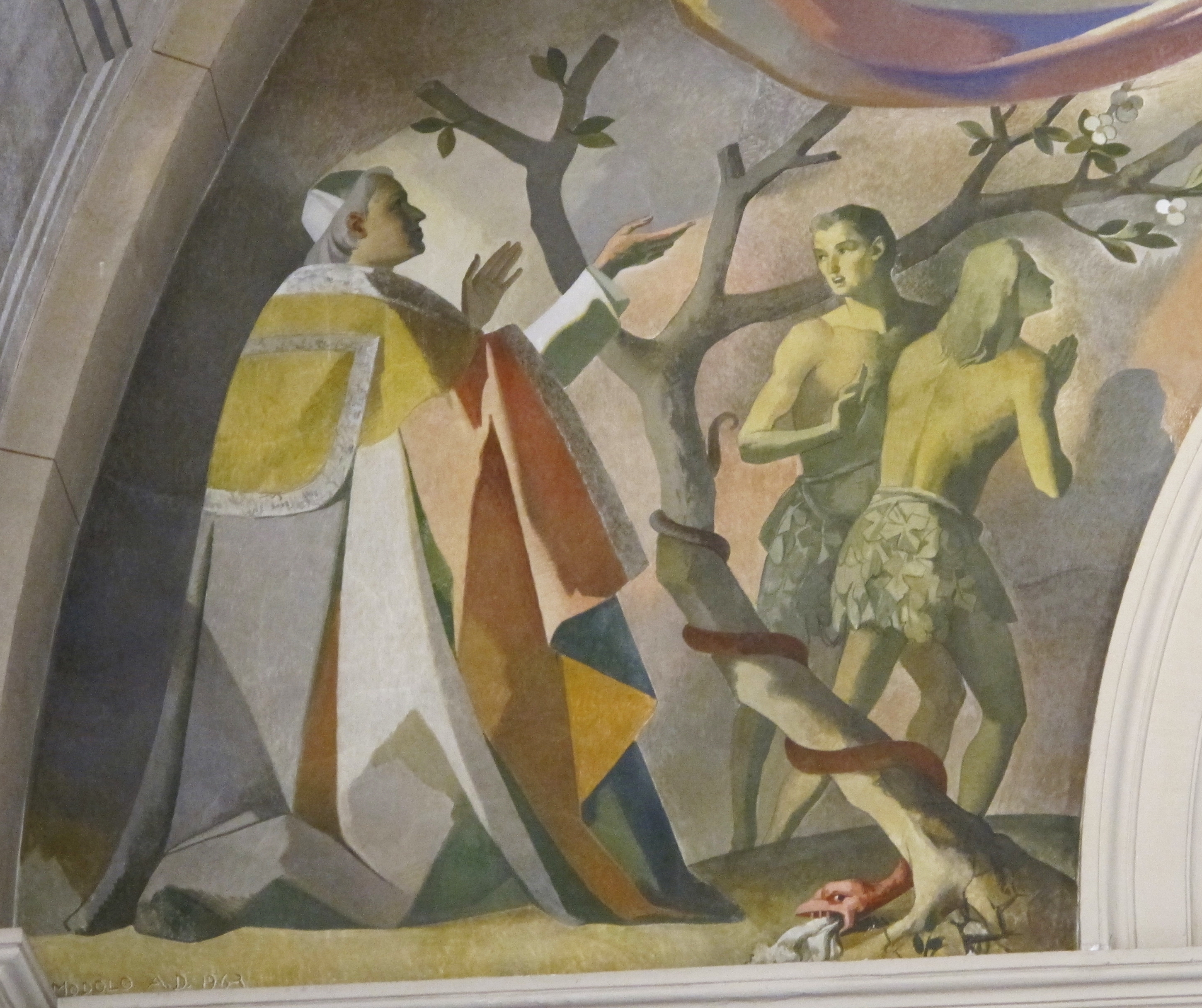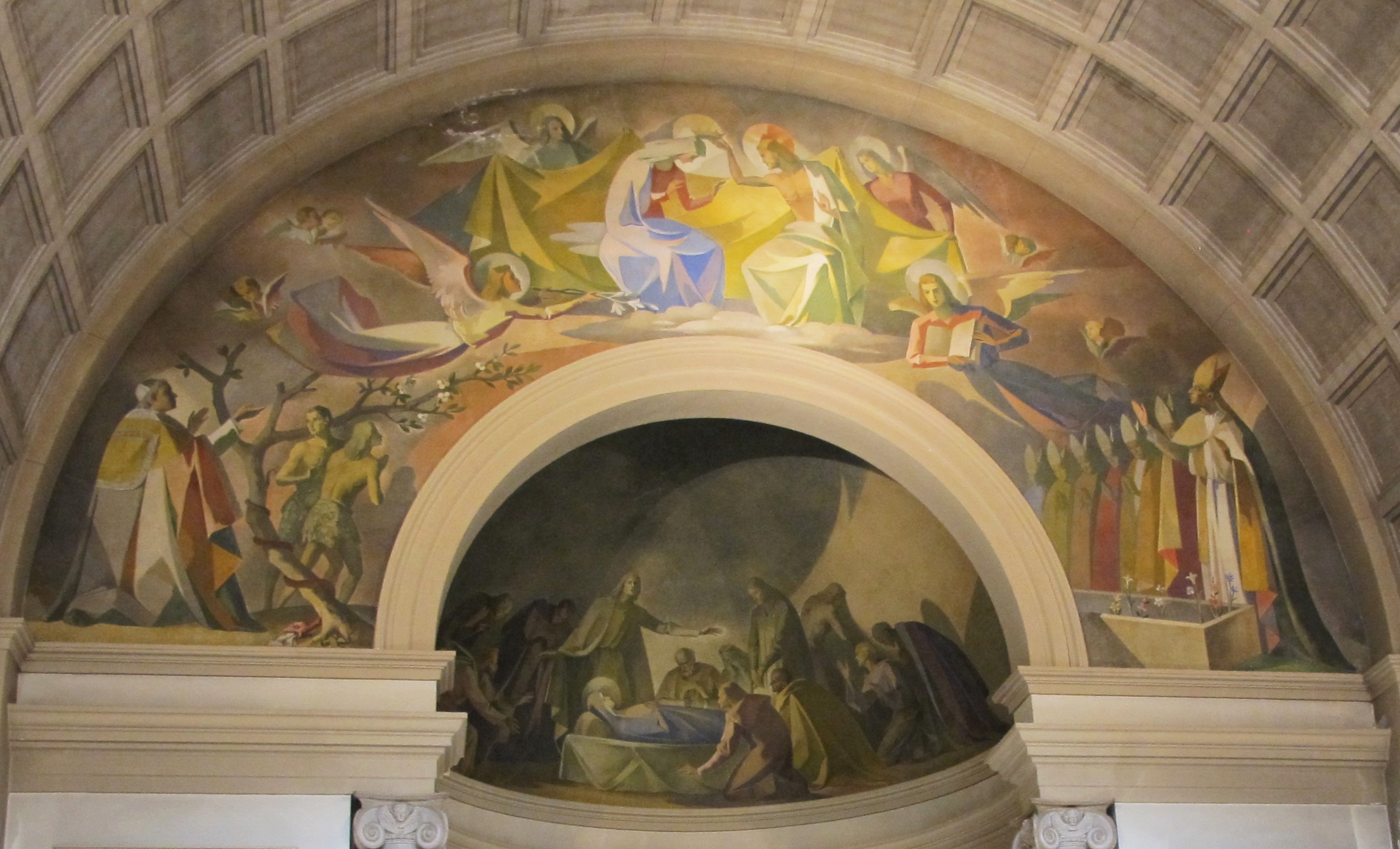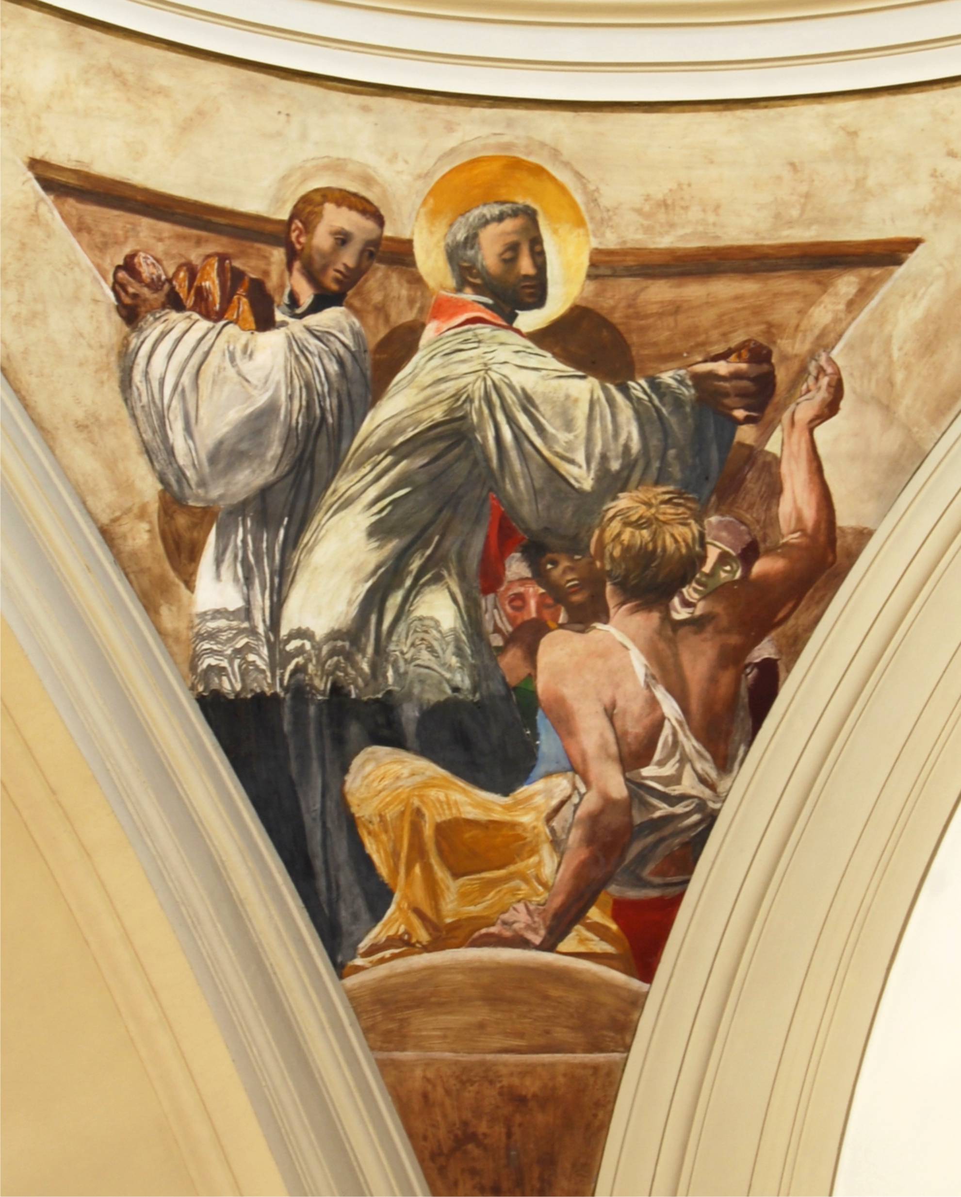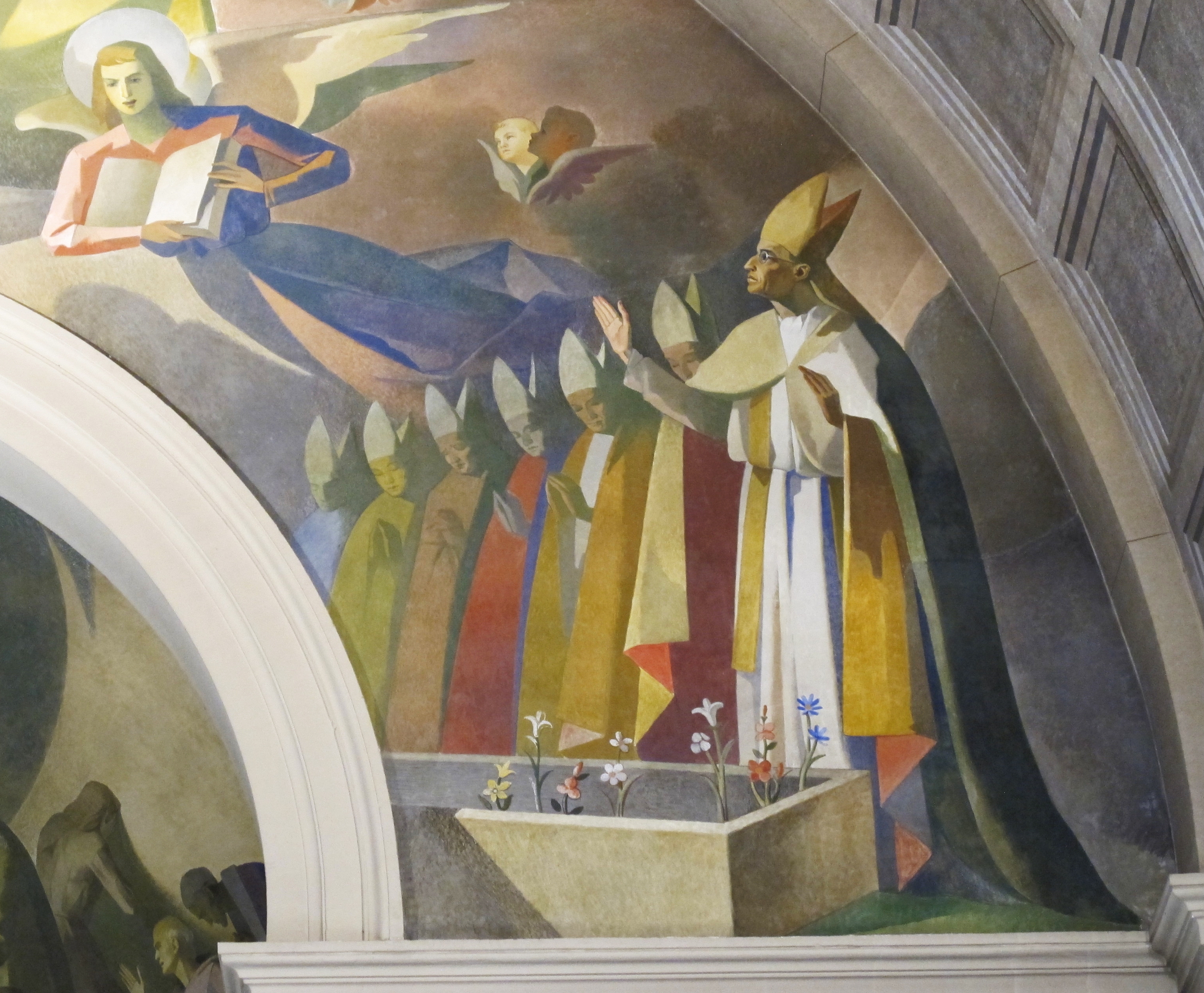 Il secondo conflitto mondiale interrompe i lavori che vengono ripresi dall’Arciprete Lino Pertile (1947-1964) che riesce a portarli a termine e a dare “unità, respiro, luce al tempio” ; tra il 1949 e il 1954 si porta a termine la facciata, si alza la navata mediana di oltre 4 metri, si ampliano le arcate di ingresso alla cupola e al presbiterio e l’interno viene inondato di luce ed il soffitto prezioso restaurato riappare nel suo splendore. Nel 1952 e nel 1963 vengono eseguiti degli affreschi sui pennacchi della cupola, sull’arco trionfale della navata mediana e sulla parete di fondo del presbiterio.